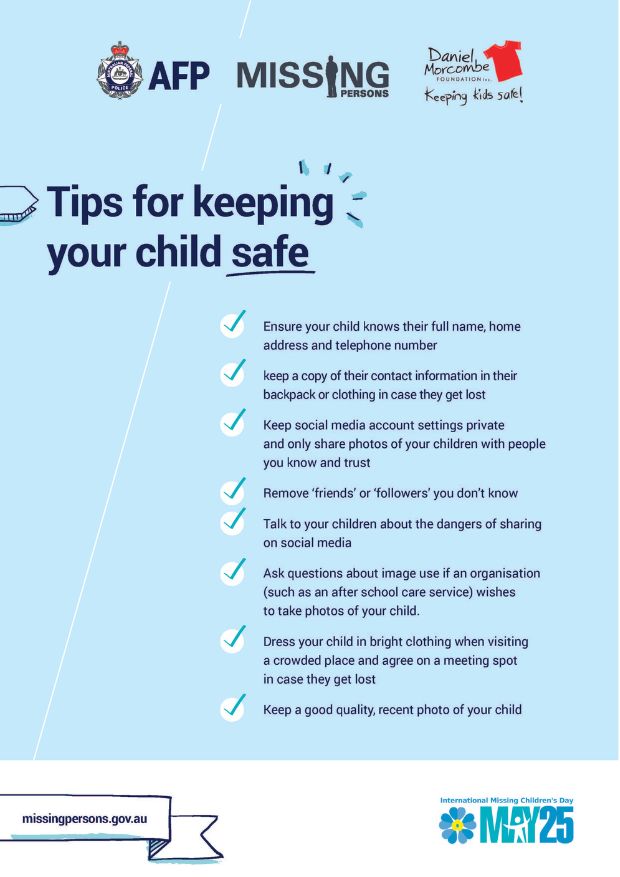 This year the National Missing Persons Coordination Centre will mark International Missing Children’s Day (IMCD) by launching a suite of tools and resources – in partnership with the Daniel Morcombe Foundation – to help facilitate conversations between children and their parents/guardians to promote safe behaviour.